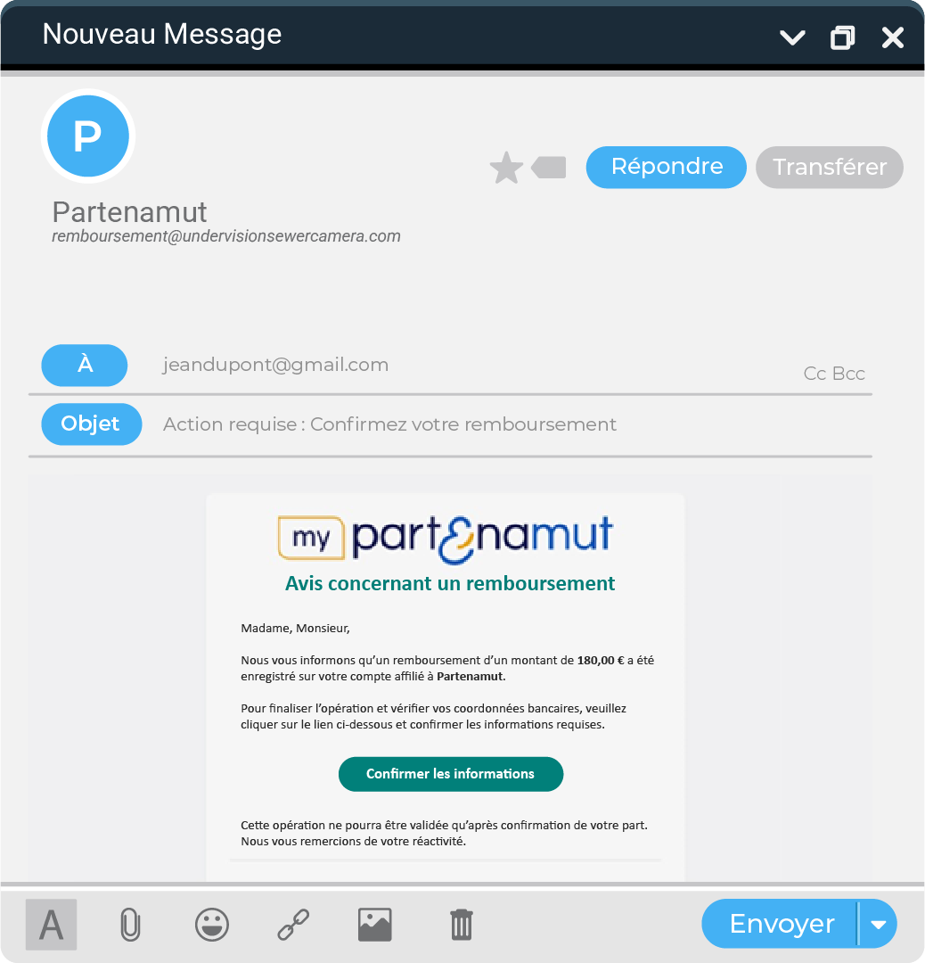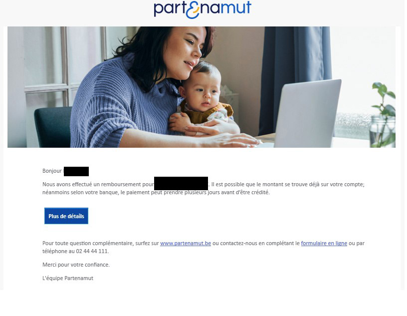 Ces e-mails frauduleux envoyés au nom de Partenamut visent aléatoirement des clients ou non-clients de Partenamut et ne sont évidemment pas envoyés par nos soins.